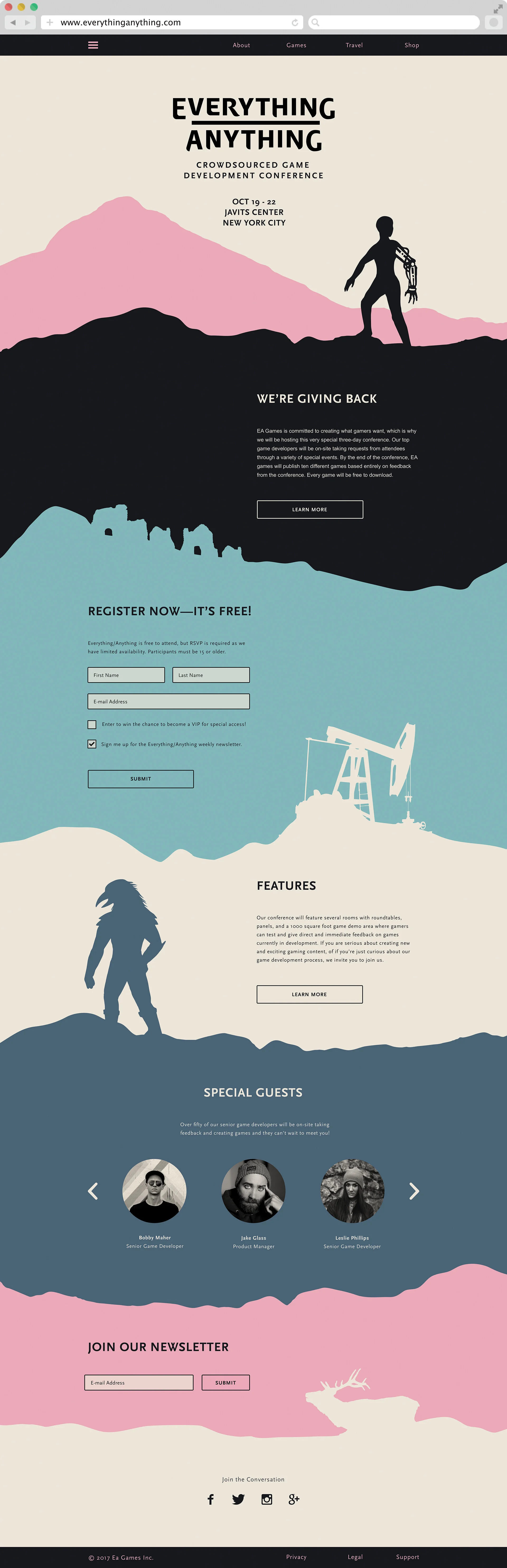 EA Games has a reputation among gamers as a company that isn’t connected with its audience and creates uninspired and repetitive games. I came up with the idea of a game development conference that puts gamers themselves at the forefront of development and titled it Everything Anything (a play on EA).